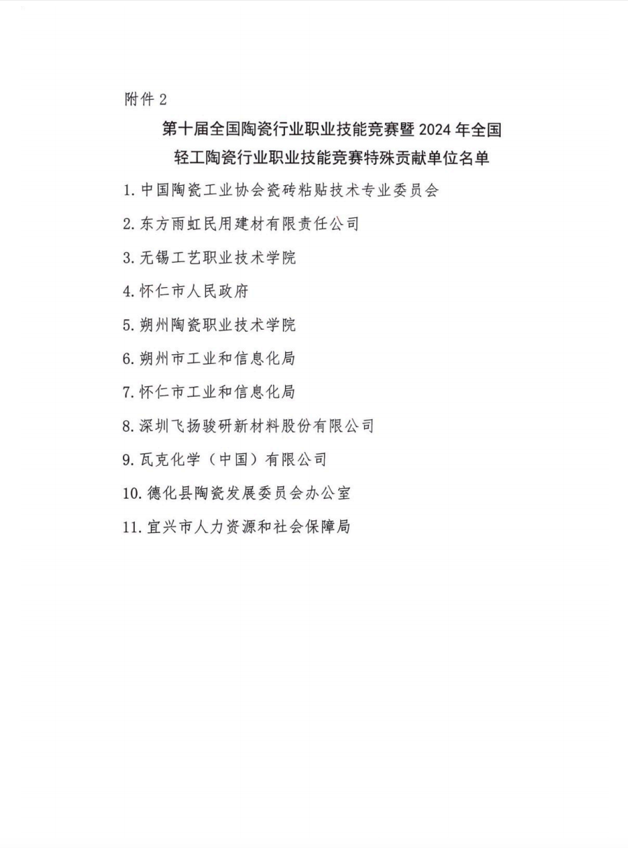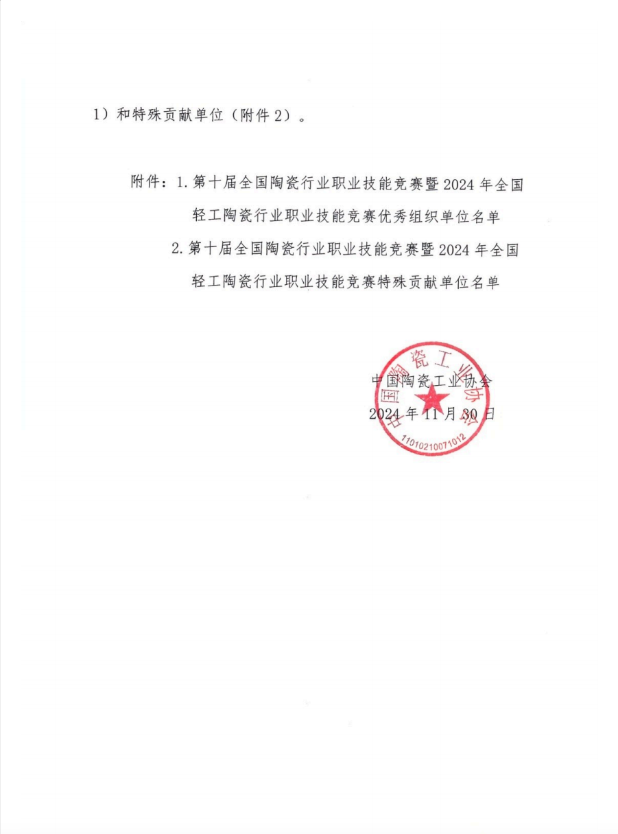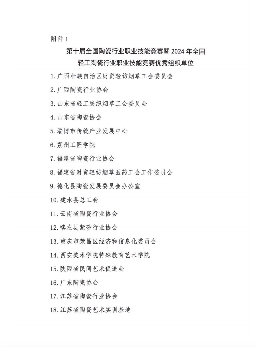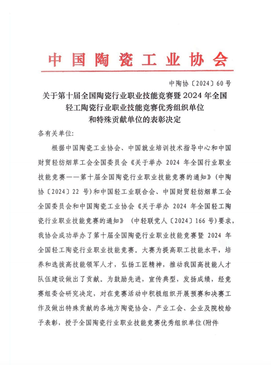 關(guān)于第十屆全國陶瓷行業(yè)職業(yè)技能競賽暨2024年全國輕工陶瓷行業(yè)職業(yè)技能競賽優(yōu)秀組織單位和特殊貢獻(xiàn)單位的表彰決定