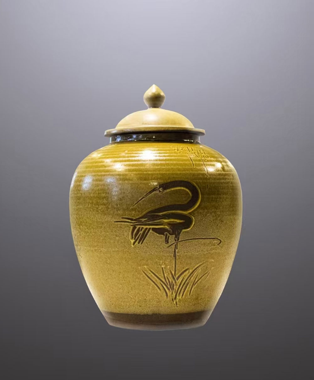 書畫、水花的傳統(tǒng)裝飾技藝,其中“水花”是管窯最具有標志性特色的陶器裝飾工藝。其工藝流程為:使用黃白膠泥手工拉坯成型,陶坯干后,在表面刷一層管窯傳統(tǒng)的白色化妝土,化妝土處于半干半濕時,用自制工具快速刻畫出紋樣,形成凹痕,等待坯干后,再上草木灰釉,入窯燒至1200度成器。何良法的作品水花圓壇(圖2)運用水花工藝,刻畫了一只側(cè)身回首的仙鶴雙腿交錯,獨立于水邊的水草之上。仙鶴的腳抬起90度,幾乎與地面平行,仿佛是瞬間彈起,通過這樣的造型,生動表現(xiàn)了仙鶴回首抬腳的瞬間,鶴的形象優(yōu)雅且充滿動感,與水草形成畫面的平衡。從筆痕可以看出,刻畫一氣呵成,線條粗細變化且富有彈性,鶴的神韻淋漓展現(xiàn),“逸筆草草,不求形似”。水花將中國畫的寫意性與陶瓷工藝完美融合,而這正是管窯陶瓷極具地域性特色的藝術(shù)表現(xiàn),是管窯陶藝術(shù)的靈魂基因。值得一提的是,這種類似的圓壇子在過去是管窯老百姓存放紅薯片、蠶豆、花生等食物的普通日常用品?!笆镣馓請@”將管窯傳統(tǒng)技藝深入挖掘,沉淀打磨,結(jié)合老百姓的審美,使得放食物圓壇子成為了實用性的工藝品,起到了提升人們審美和生活品質(zhì)的作用,是日用陶向工藝陶轉(zhuǎn)化的非常重要的一步。