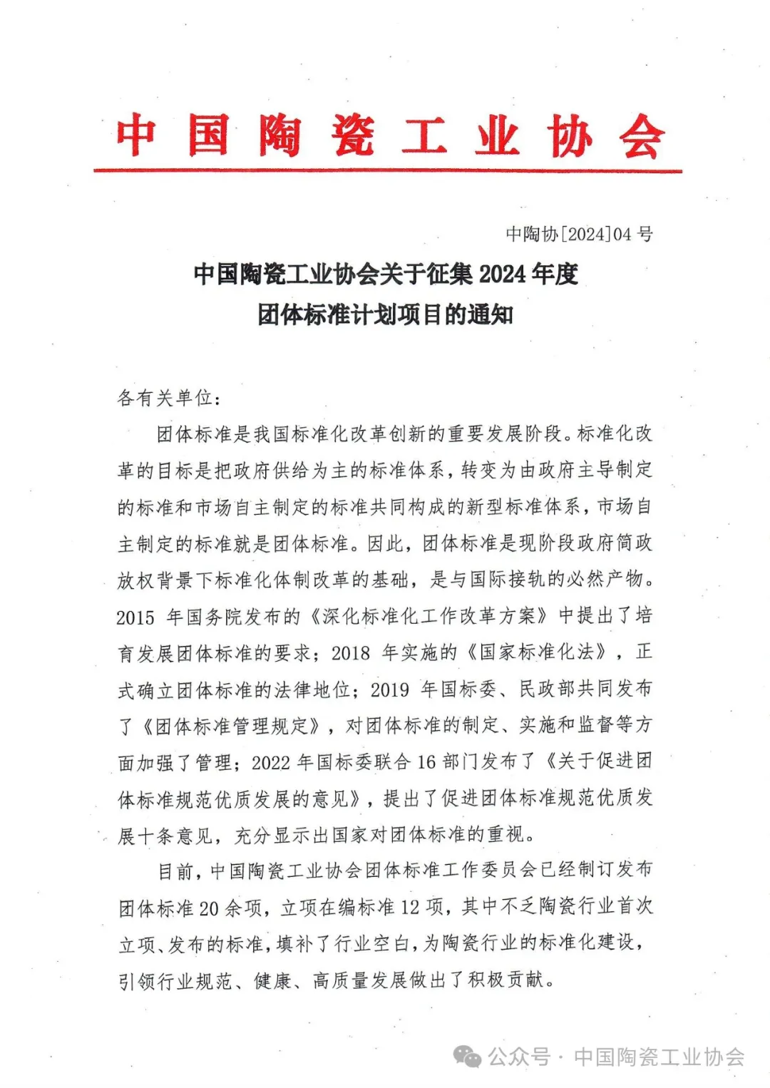 中國陶瓷工業(yè)協(xié)會團(tuán)體標(biāo)準(zhǔn)項目建議書
