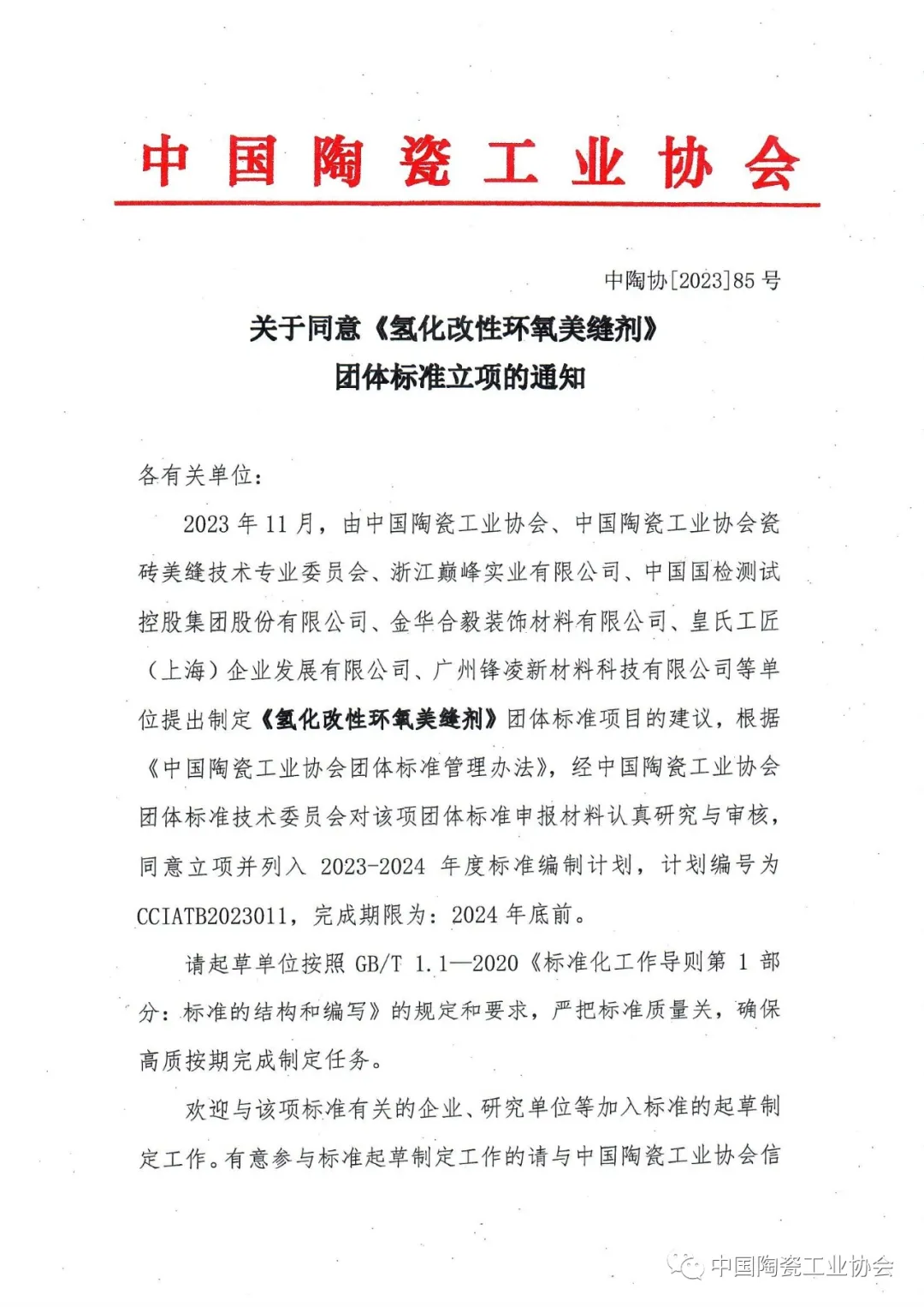 各有關單位:2023年11月,由中國陶瓷工業(yè)協(xié)會、中國陶瓷工業(yè)協(xié)會瓷磚美縫技術專業(yè)委員會、浙江巔峰實業(yè)有限公司、中國國檢測試控股集團股份有限公司、金華合毅裝飾材料有限公司、皇氏工匠(上海)企業(yè)發(fā)展有限公司、廣州鋒凌新材料科技有限公司等單位提出制定《氫化改性環(huán)氧美縫劑》團體標準項目的建議,根據(jù)《中國陶瓷工業(yè)協(xié)會團體標準管理辦法》,經(jīng)中國陶瓷工業(yè)協(xié)會團體標準技術委員會對該項團體標準申報材料認真研究與審核,同意立項并列入2023-2024年度標準編制計劃,計劃編號為CCIATB2023011,完成期限為:2024年底前。請起草單位按照GB/T 1.1—2020《標準化工作導則第1部分:標準的結構和編寫》的規(guī)定和要求,嚴把標準質(zhì)量關,確保高質(zhì)按期完成制定任務。歡迎與該項標準有關的企業(yè)、研究單位等加入標準的起草制定工作。有意參與標準起草制定工作的請與中國陶瓷工業(yè)協(xié)會信息科技部聯(lián)系。