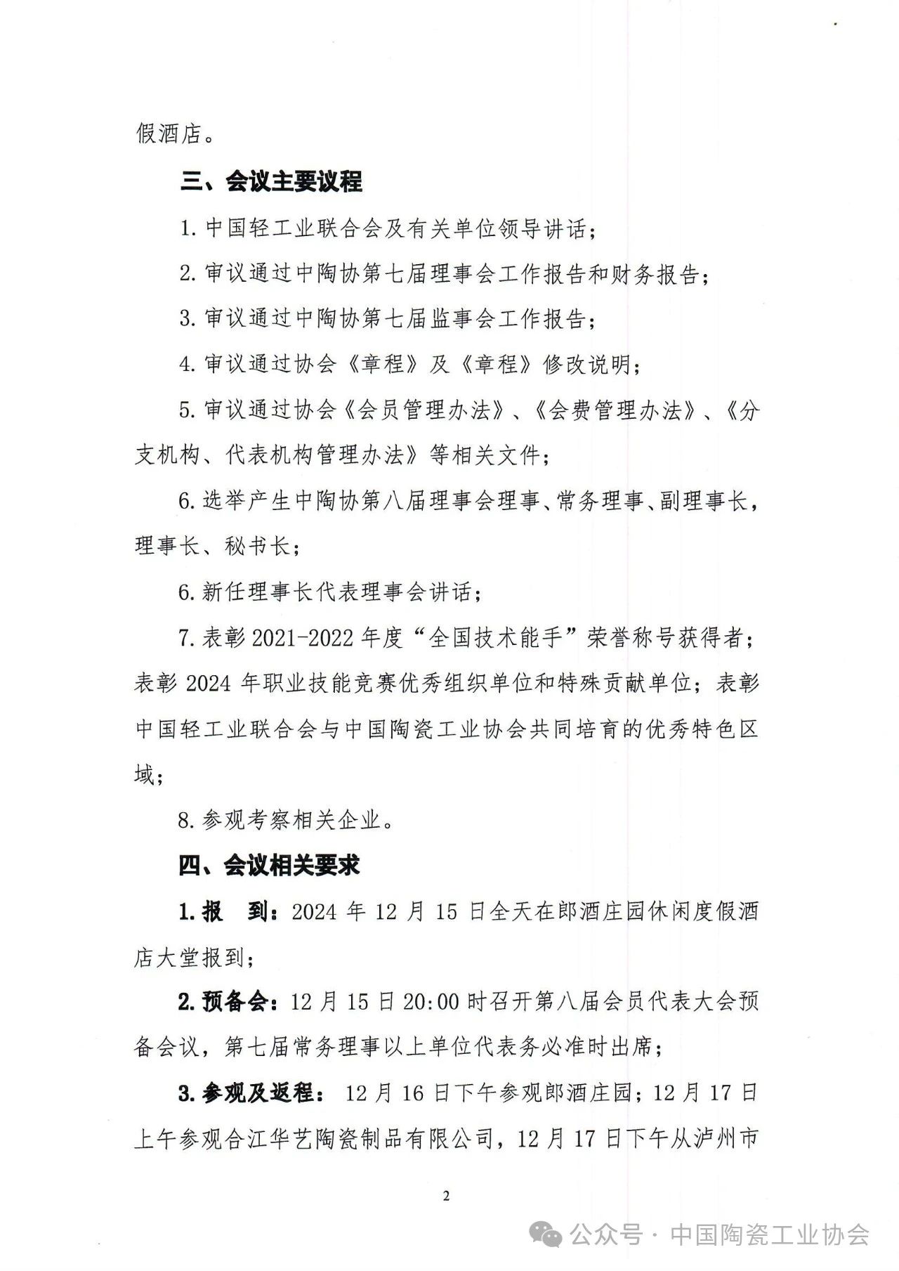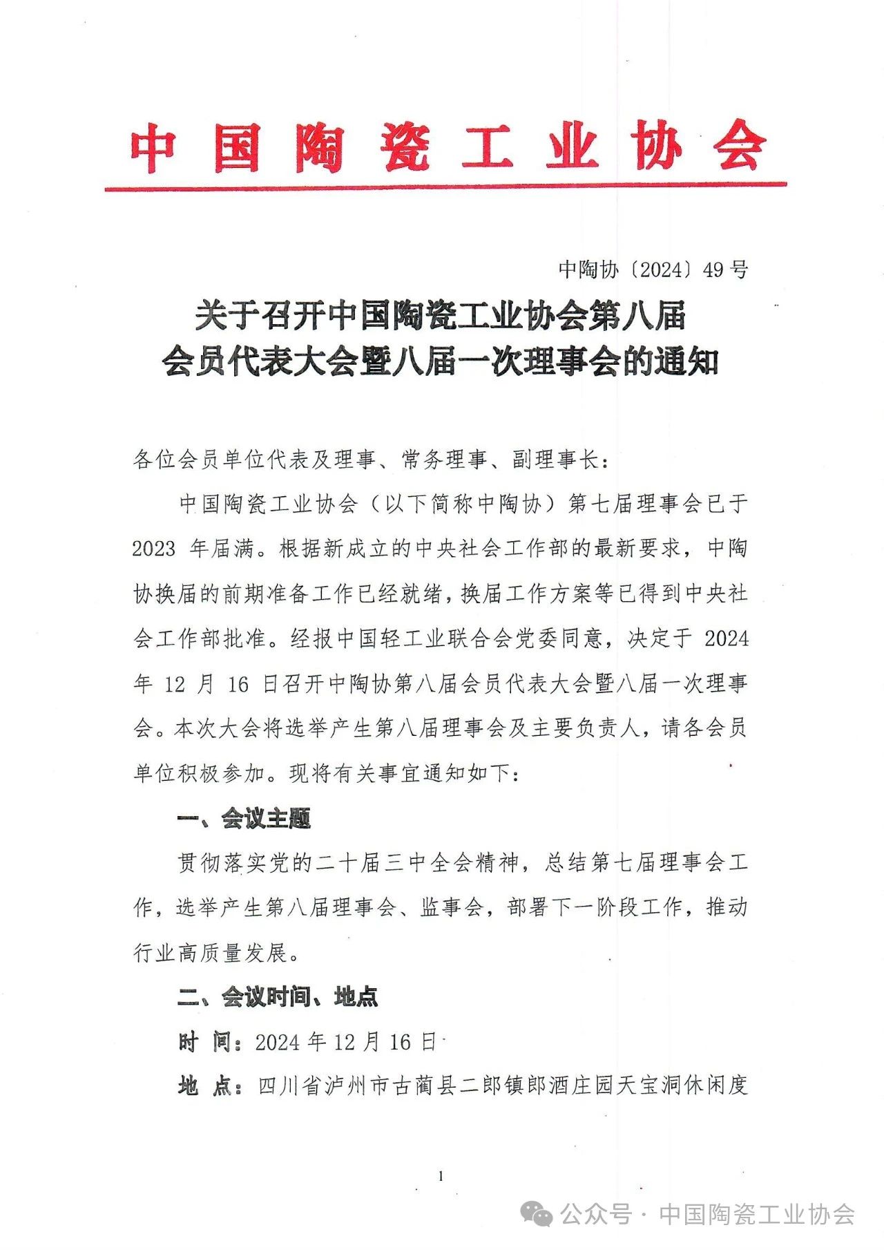 【通知】關(guān)于召開(kāi)中國(guó)陶瓷工業(yè)協(xié)會(huì)第八屆會(huì)員代表大會(huì)暨八屆一次理事會(huì)的通知