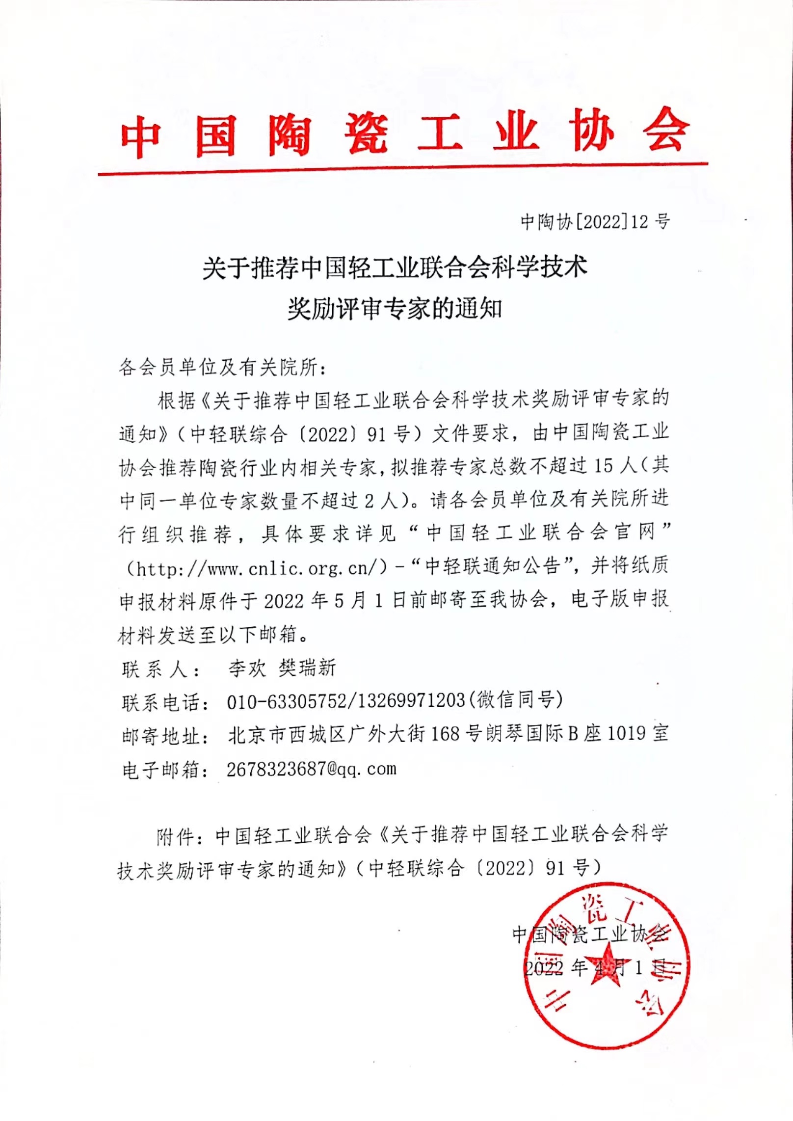 ?根據(jù)《關(guān)于推薦中國(guó)輕工業(yè)聯(lián)合會(huì)科學(xué)技術(shù)獎(jiǎng)勵(lì)評(píng)審專家的通知》(中輕聯(lián)綜合〔2022〕91號(hào))文件要求,由中國(guó)陶瓷工業(yè)協(xié)會(huì)推薦陶瓷行業(yè)內(nèi)相關(guān)專家,擬推薦專家總數(shù)不超過15人(其中同一單位專家數(shù)量不超過2人)。請(qǐng)各會(huì)員單位及有關(guān)院所進(jìn)行組織推薦,具體要求詳見“中國(guó)輕工業(yè)聯(lián)合會(huì)官網(wǎng)”(http://www.cnlic.org.cn/)-“中輕聯(lián)通知公告”,并將紙質(zhì)申報(bào)材料原件于2022年5月1日前郵寄至我協(xié)會(huì),電子版申報(bào)材料發(fā)送至以下郵箱。