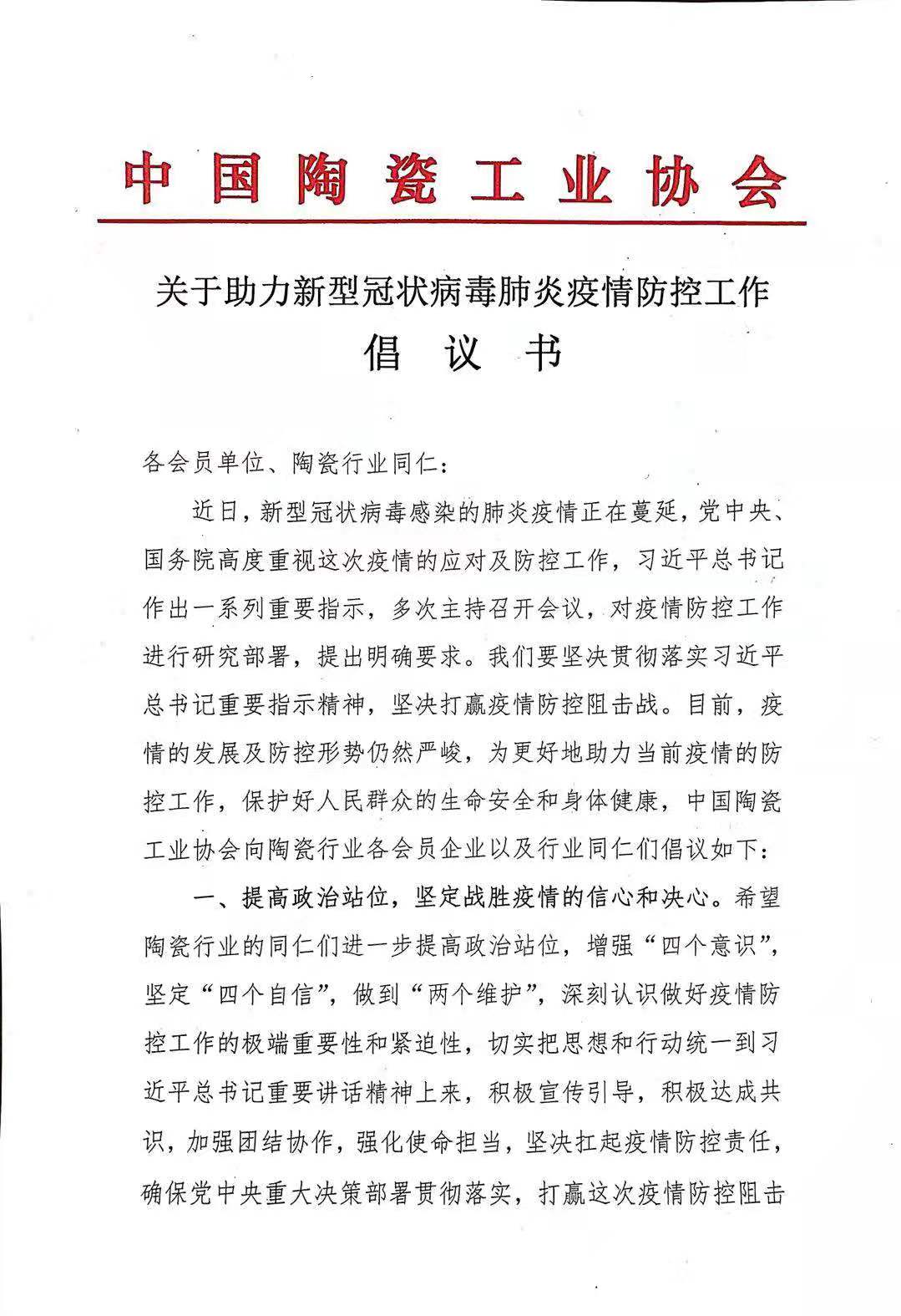 近日,新型冠狀病毒感染的肺炎疫情正在蔓延,黨中央、國務(wù)院高度重視這次疫情的應(yīng)對及防控工作,習(xí)近平總書記作出一系列重要指示,多次主持召開會議,對疫情防控工作進(jìn)行研究部署,提出明確要求。我們要堅決貫徹落實(shí)習(xí)近平總書記重要指示精神,堅決打贏疫情防控阻擊戰(zhàn)。目前,疫情的發(fā)展及防控形勢仍然嚴(yán)峻,為更好地助力當(dāng)前疫情的防控工作,保護(hù)好人民群眾的生命安全和身體健康,中國陶瓷工業(yè)協(xié)會向陶瓷行業(yè)各會員企業(yè)以及行業(yè)同仁們倡議如下: