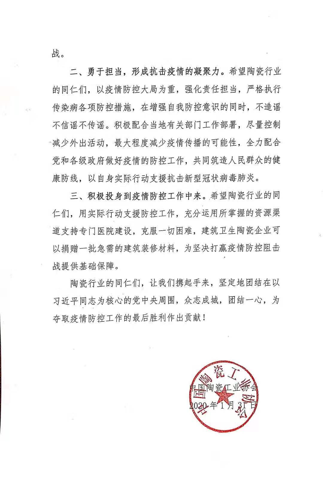 陶瓷行業(yè)的同仁們,讓我們攜起手來,堅定地團(tuán)結(jié)在以習(xí)近平同志為核心的黨中央周圍,眾志成城,團(tuán)結(jié)一心,為奪取疫情防控工作的最后勝利作出貢獻(xiàn)!