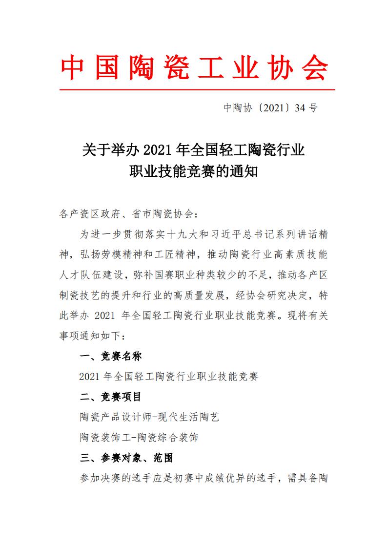 為進(jìn)一步貫徹落實(shí)十九大和習(xí)近平總書記系列講話精神,弘揚(yáng)勞模精神和工匠精神,推動陶瓷行業(yè)高素質(zhì)技能人才隊(duì)伍建設(shè),彌補(bǔ)國賽職業(yè)種類較少的不足,推動各產(chǎn)區(qū)制瓷技藝的提升和行業(yè)的高質(zhì)量發(fā)展,經(jīng)協(xié)會研究決定,特此舉辦2021年全國輕工陶瓷行業(yè)職業(yè)技能競賽。現(xiàn)將有關(guān)事項(xiàng)通知如下:
