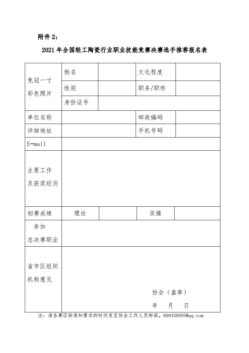 ? ? ? 2.2021年全國輕工陶瓷行業(yè)職業(yè)技能競賽決賽選手 推薦報(bào)名表