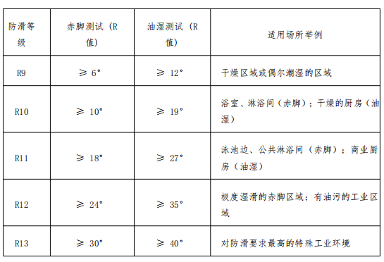 根據(jù)上述測試方法的結(jié)果,材料被劃分為不同的防滑等級,從P0(極度危險)到P5(超高防滑)。